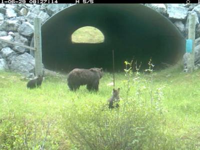 A grizzly bear family uses a metal culvert underpass. As more and more roa...