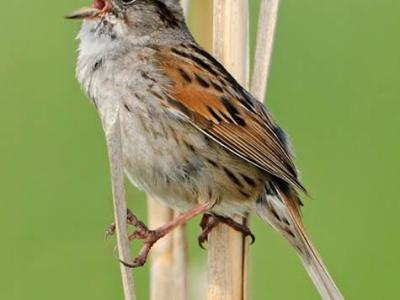 A swamp sparrow sings in a marsh near Cold Lake Provincial Park, Canada. I...