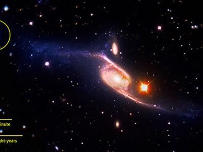 This composite of the giant barred spiral galaxy NGC 6872 combines visible ...