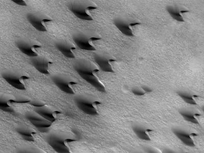 Barchan dunes inside Arkhangelsky Crater in the southern hemisphere of Mars...