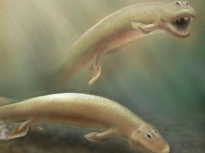 A color illustration of Tiktaalik swimming and walking in water. Fossils ...