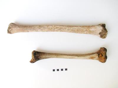 The giant's tibia, or shinbone, compared with that of a normal Roman male o...