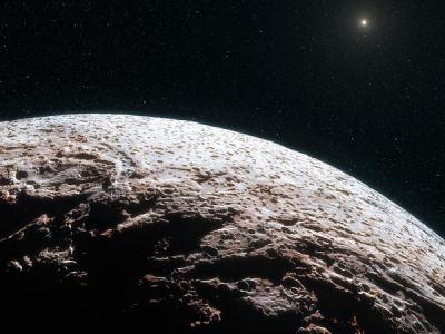 This artist’s impression shows the surface of the distant dwarf planet Mak...