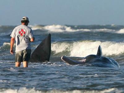 A beached sperm whale lies in the surf near Port Aransas, Texas, on the U.S...