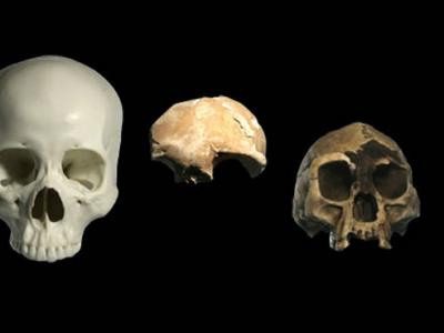 A model of Homo floresiensis's skull (right) is shown with a modern human's...