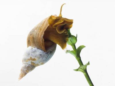 A great pond snail clings to a plant stem (file photo). Brian Handwerk fo...