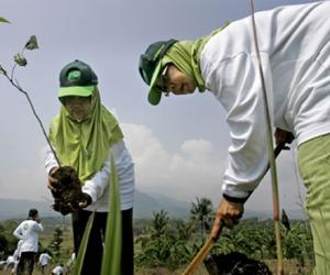 Women plant saplings as part of a tree-planting campaign in West Java, Indo...