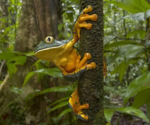 A sun-loving splendid leaf frog pauses on a tree trunk in Costa Rica. Cons...