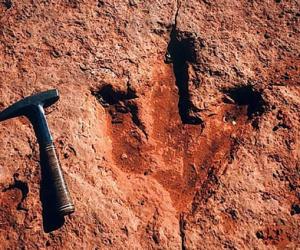 A three-toed dinosaur footprint is shown in this undated file photo taken i...
