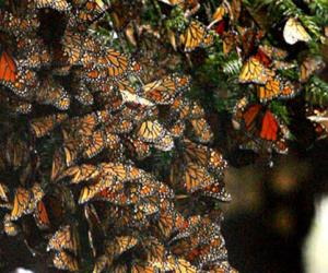 Monarch butterflies hang from a tree branch at the Monarch Butterfly Biosph...