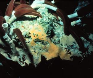 Tube worms cluster around a hydrothermal vent in the Pacific Ocean in an un...