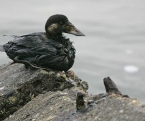 An oil-covered bird takes refuge Thursday on the shore at Fort Baker, which...