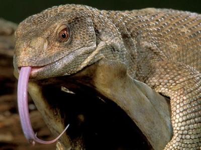 A monitor lizard hugs a branch. Monitor lizards breathe by taking in air t...