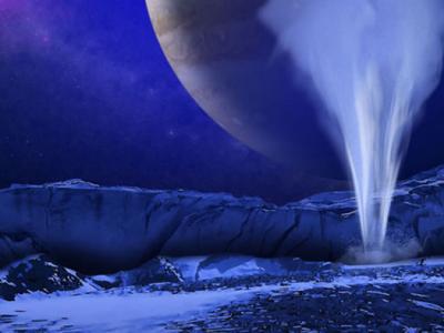 Artistic illustration of Europa's icy surface with a water jet in the foreg...