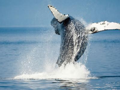 A humpback whale breaching. Five distinct humpback whale populations have ...