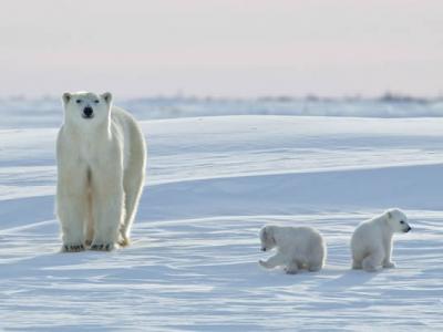 A polar bear watches over two cubs in Hudson Bay, near the town of Churchil...