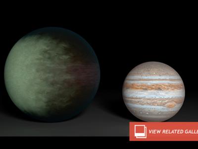 An artist's rendition of Gliese 1214 b traveling in front of its star, show...