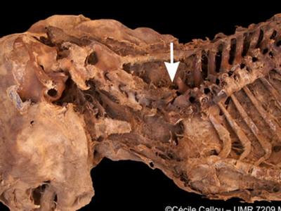 Close-up of the post mortem vertebral dislocation located between the sixth...