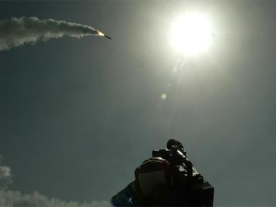A cameraman films a Tomahawk cruise missile as it flies toward Iraq after b...