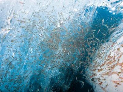 Krill feeds on phytoplankton that grows on the underside of sea ice on Sout...