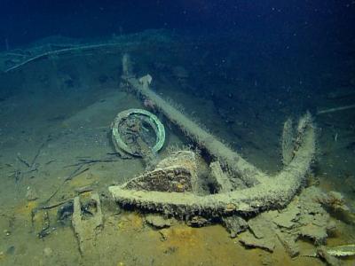 The anchor of a ship rests on the seafloor. A team of researchers excavati...