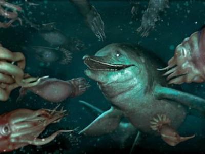 An ancient ichthyosaur hunts squid-like animals in an artist's rendering. ...