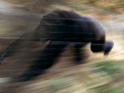 An adult male chimpanzee runs through Tchimpounga Sanctuary in the Republic...