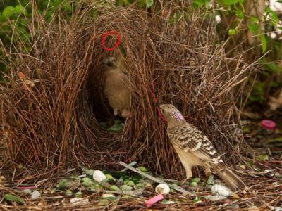 A great bowerbird displaying to a female who has entered his bower. Someti...