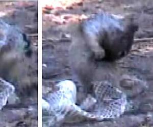 Video stills show a ground squirrel chewing on a rattlesnake's shed skin an...