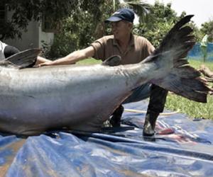 Two Thai fishermen show a 646-pound (293-kilogram) giant catfish—an endang...