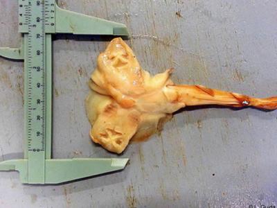 The two-headed fiddler ray fetus, as seen from the bottom. They say two he...