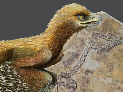 An artist's conception of Aurornis xui, a new early avian theropod from the...