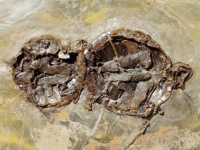 The fossilized mating turtles were exposed in part by the males' smaller si...