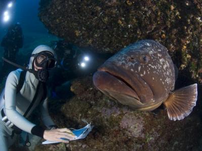 Pierre-Yves Cousteau comes face to face with a dusky grouper in Cabrera Arc...