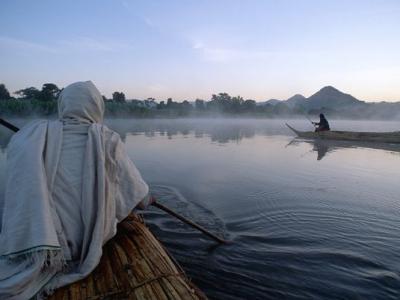 Papyrus reed boats cross the Blue Nile River in Ethiopia, where some people...