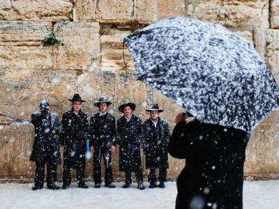 Snow falls in Jerusalem as visitors pose for pictures in front of the Weste...