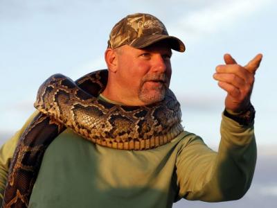 Bill Booth wears a dead Burmese python he caught in Florida as part of the ...
