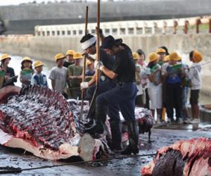 School children on a field trip watch and take notes as a Baird's Beaked wh...