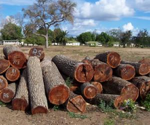Logs of indigenous hardwood await export in southern Tanzania's Rufiji Dist...