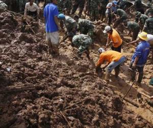 Rescuers search for victims at a village hit by landslides in Tawangmangu, ...