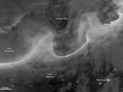 北美上空的极光 美国宇航局地球观测站公布了一张卫星照片,展示了北美上空美丽的...