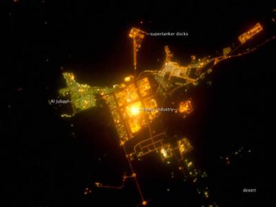 沙特阿拉伯阿尔朱拜勒市奇特的夜景 美国宇航局地球观测站今日公布了一张卫星照片...