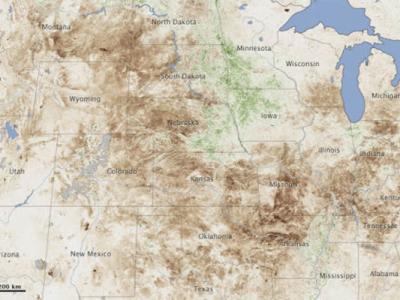 这幅美国农作物受灾地图是根美国宇航局的Terra卫星上的中分辨率成像光谱仪(MODIS...