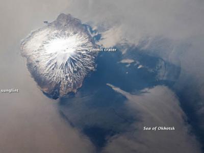 从国际空间站上看,阿莱德火山周围的大部分海域正好是太阳返辉区,看上去像一面银...