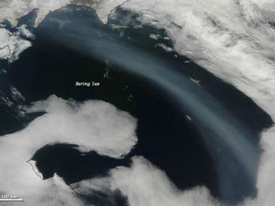 2012年05月11日,一条烟羽飘过白令海上空,被美国宇航局Terra卫星上的中分辨率成...