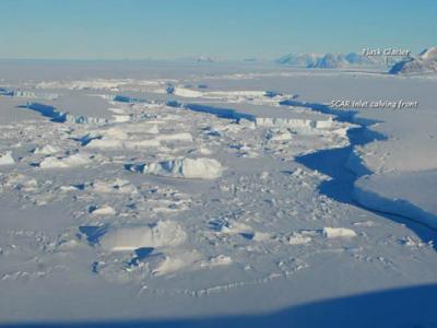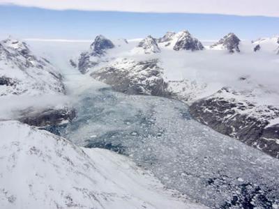 照片显示了格陵兰东部的一条冰川,该冰川流经一个由冰雪运动造成的狭长谷地入海 ...