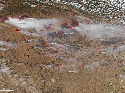 俄罗斯农田焚烧引发火灾 美国宇航局地球观测站今日公布了一张卫星照片,展示了俄...