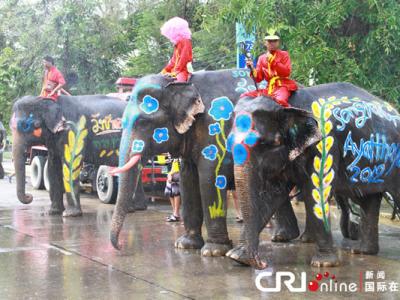 泰国“宋干节”节日彩象盛装出动 大象向过往车辆喷水 大象向路边的游客喷水...