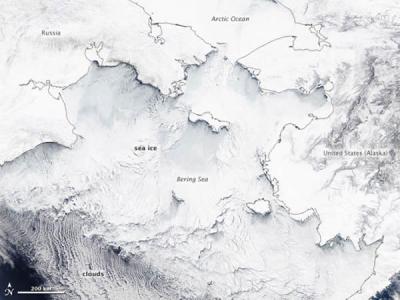 北极白令海布满海冰 美国宇航局地球观测站今日公布了一张卫星照片,展示了北极区...