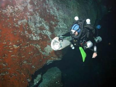 潜水探险员格雷格-斯坦登在巴哈马深海蓝洞采集微生物 日前,科学家宣称,巴哈马...